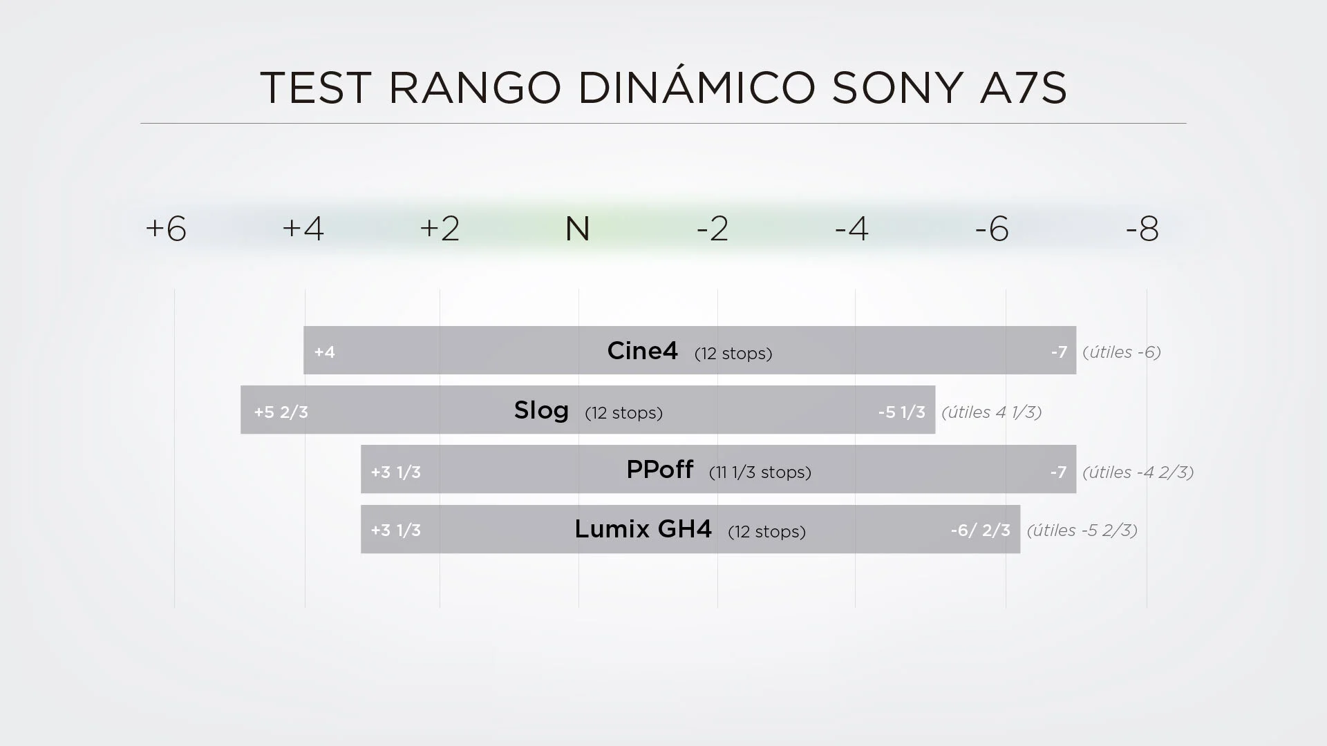 As you can see in the table and the video we have made, CINE4 offers a wide a dynamic range as the Slog but with much less noise, although this range is shifted into the shadows. Our recommendation would therefore would be to use Slog only when you are going to color grade in a professional environment; otherwise, use the profile CINE4 underexposing one step to better preserve the highlights, shadows and lift after grading.