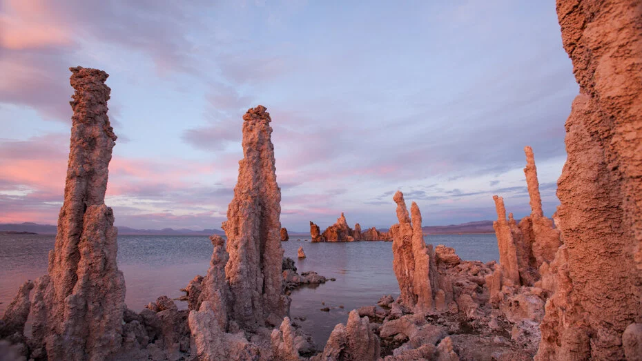 Mono Lake is a saline lake that formed more than 760,000 years ago. Due to its alkaline composition and the reception of fresh water it generates impressive limestone formations, which are visible when its water level reduces.